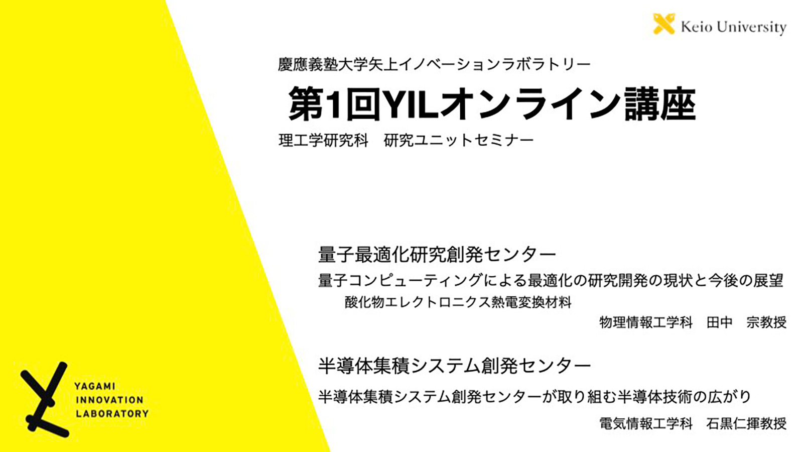 矢上イノベーションラボラトリー(YIL(イール)所在地:神奈川県横浜市港北区日吉3-14-1/ディレクター:多田宗弘)は、慶應理工の研究ユニットによる研究のご紹介や、新たな科学・技術の解説をオムニバス形式でご紹介することを目的とする、YILオンライン講座を開催しました。